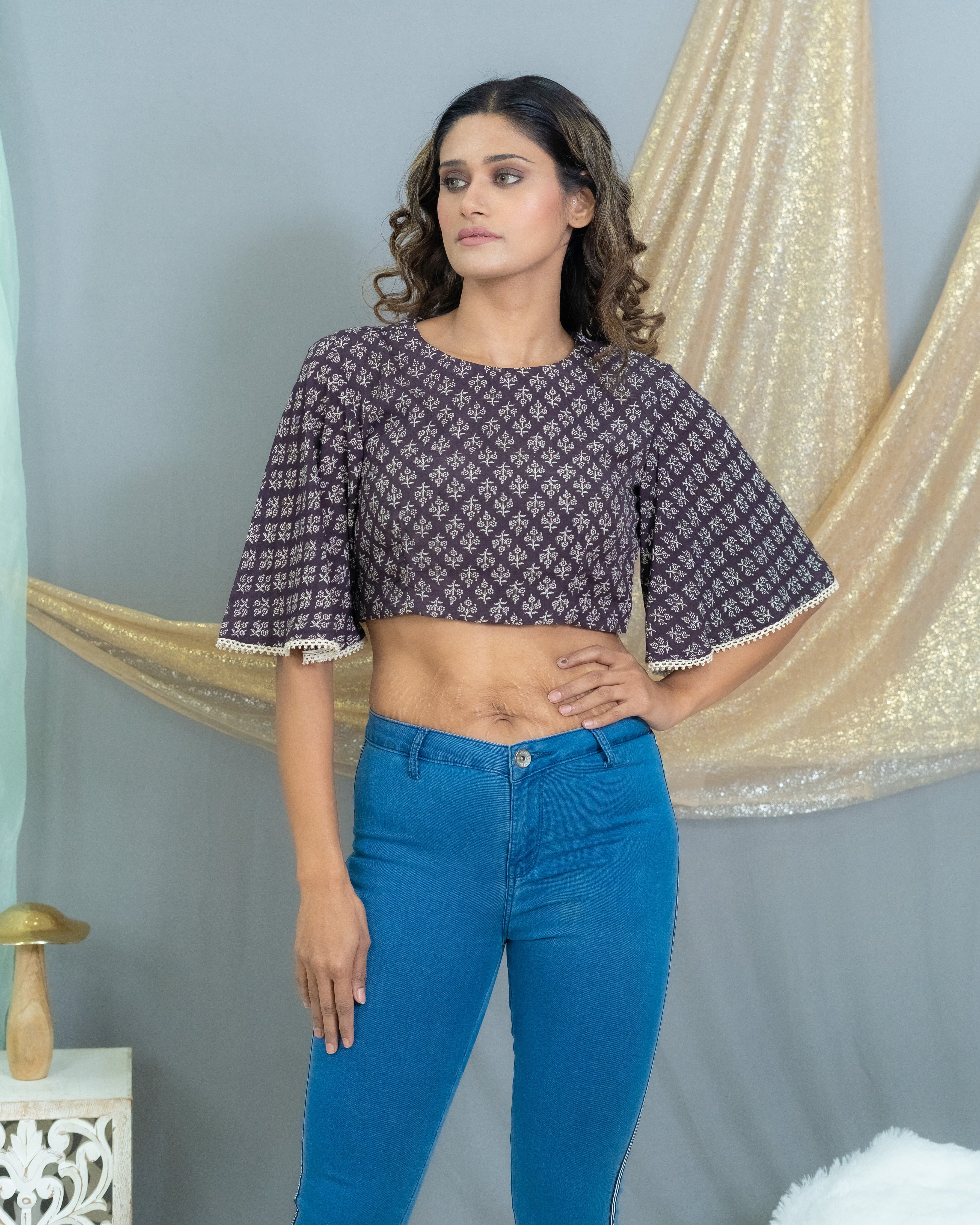 This is a Bagru Handblock print crop top in modal cotton- One of the softest fabrics we have. Oh god! This top feels like a second skin. Wear it with a skirt, jeans, shorts, or a saree - this crop top will always stand out no matter what. It has a zip on the sides, comes with 2 inches extra margin, and has cotton lining beneath except under the sleeves. Don't miss the cute lace finishing on the sleeves.