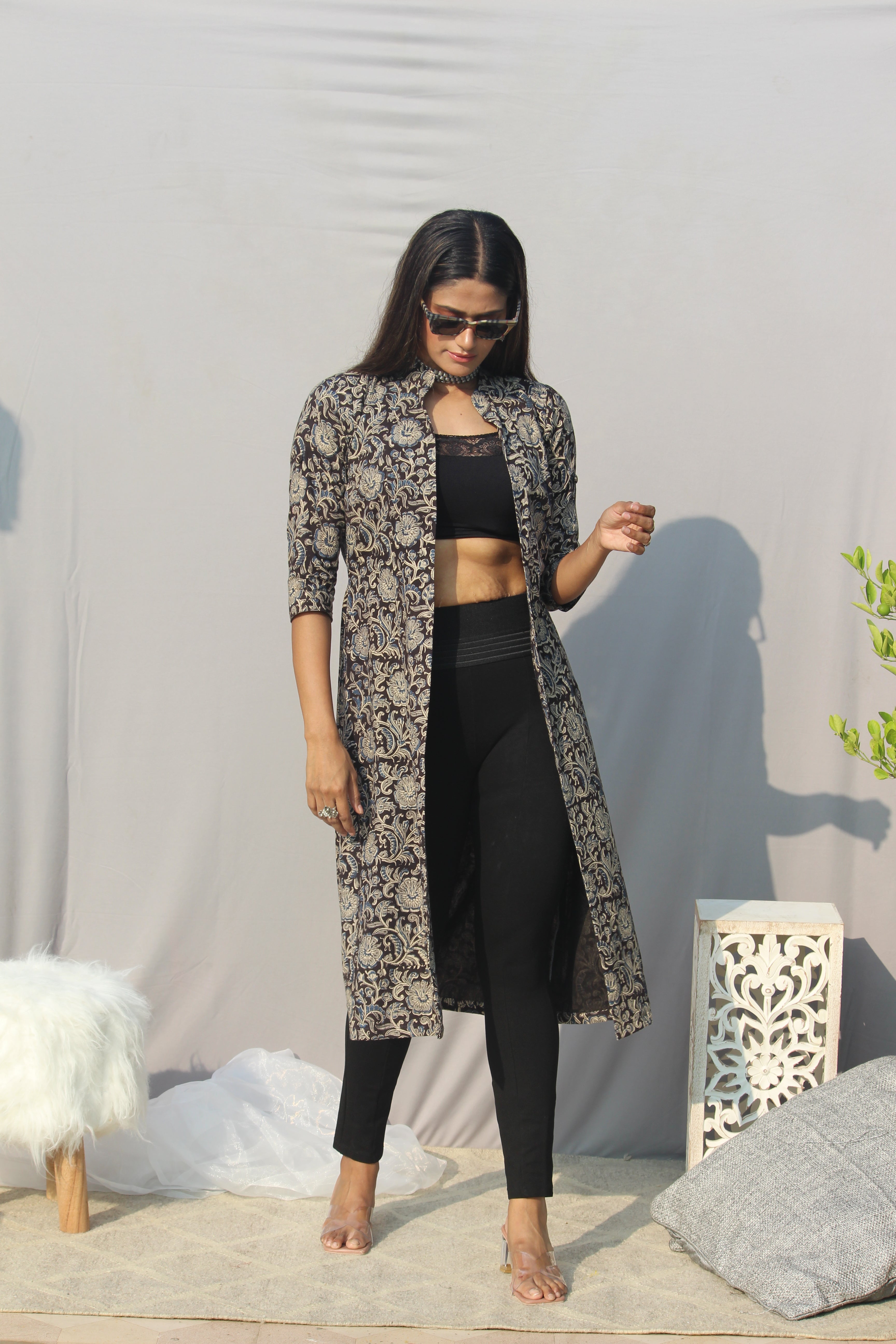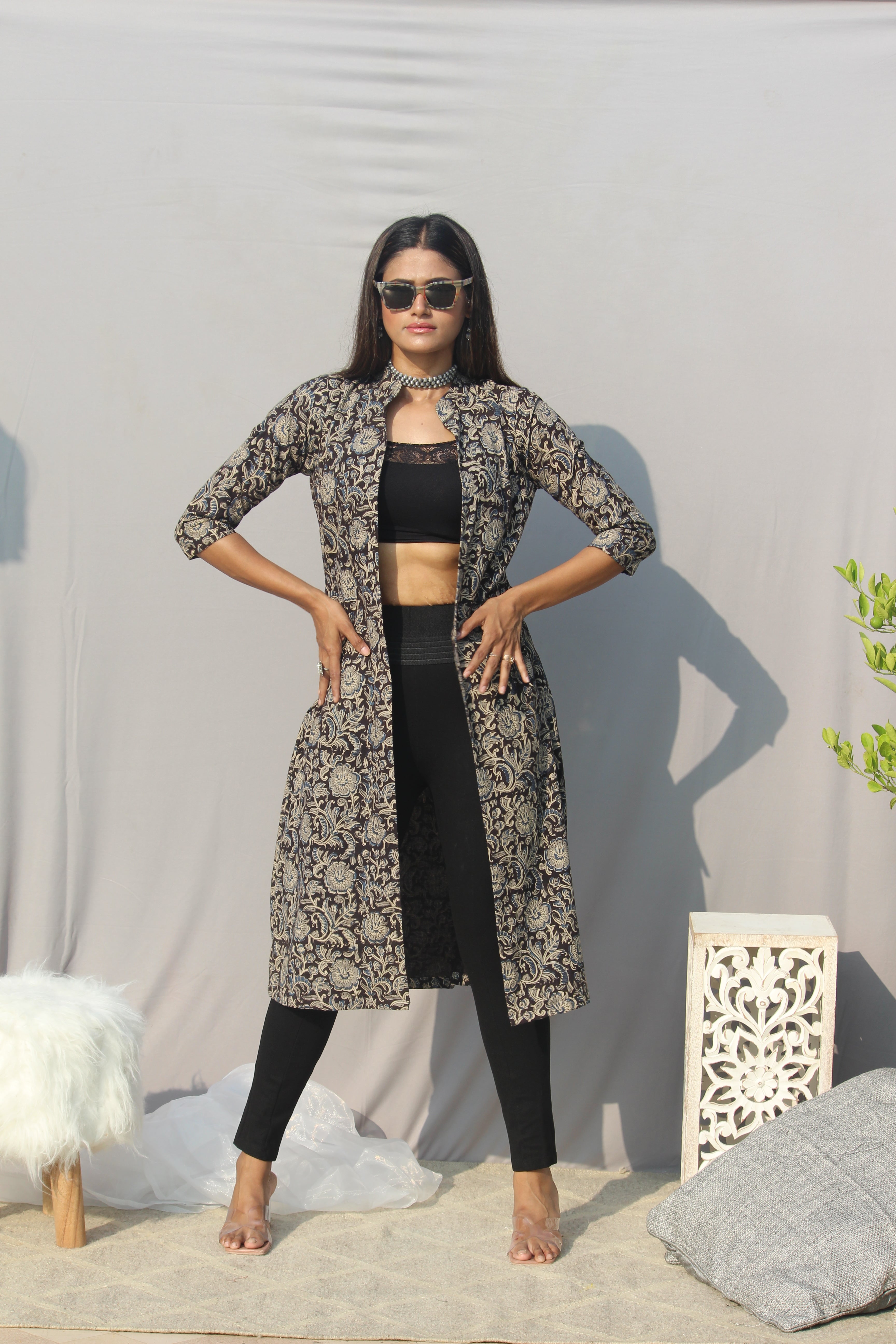 Elevate your style with the Black Kalamkari Handblock Print Cotton Shrug – a versatile, calf-length piece that adds a touch of elegance to any outfit. Crafted from premium cotton with a super-soft underlining, it offers comfort and breathability throughout the day. Sourced from Andhra Pradesh, this unique shrug features traditional handblock printing using wooden blocks and natural, sustainable dyes, ensuring each piece is one-of-a-kind. The fabric embraces natural beauty with a slight color bleed and up to 1% shrinkage. Pair it effortlessly with jeans, skirts, or shorts for a chic, stylish look that’s both timeless and eco-friendly.