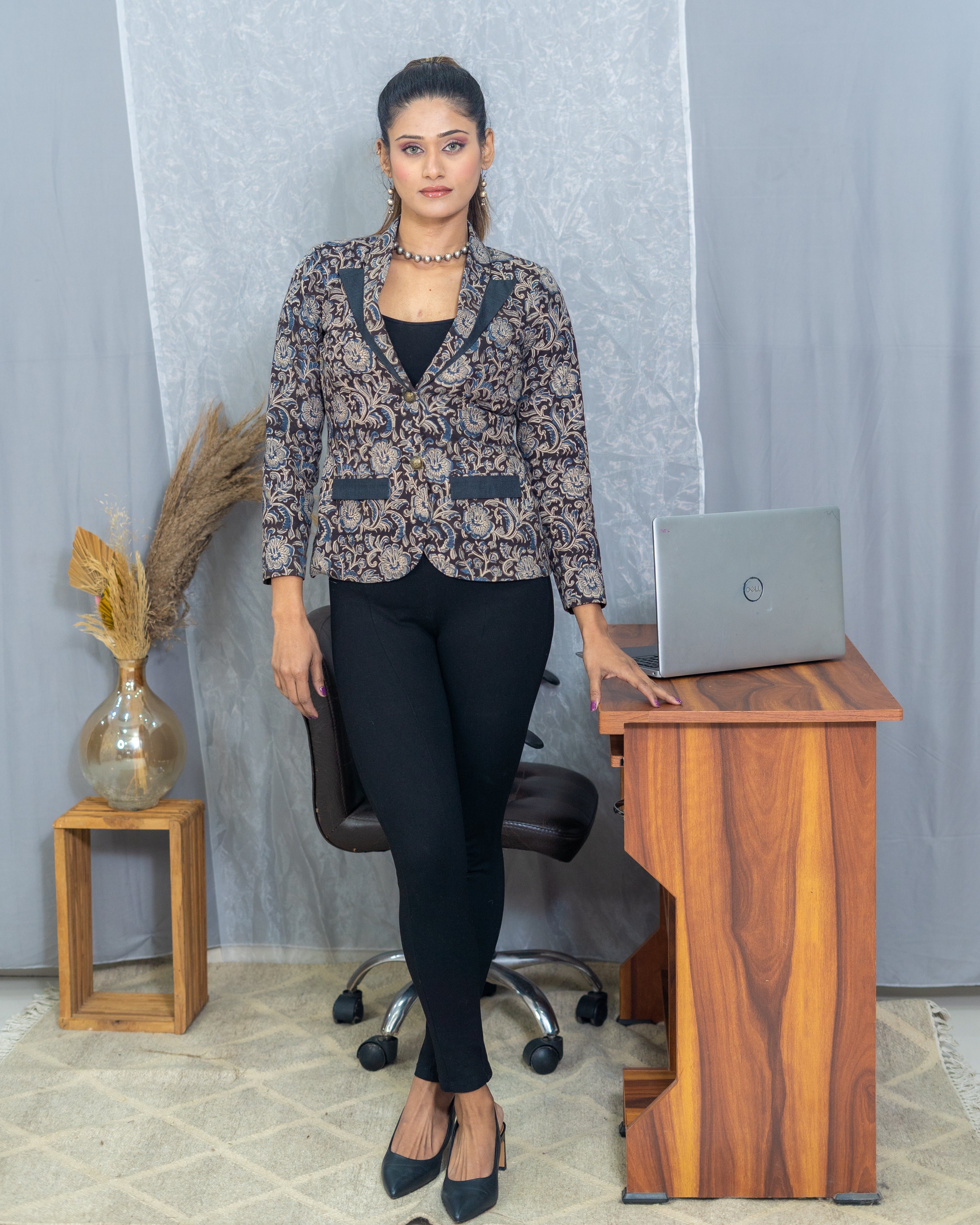 A cotton blazer made from Traditional Bagru Handblock printed fabric all the way from Andhra Pradesh. The blazer comes with double underlining, 2 pockets and 2 inches of extra margin. Perfect for summers, and "chilly winters inside your office".