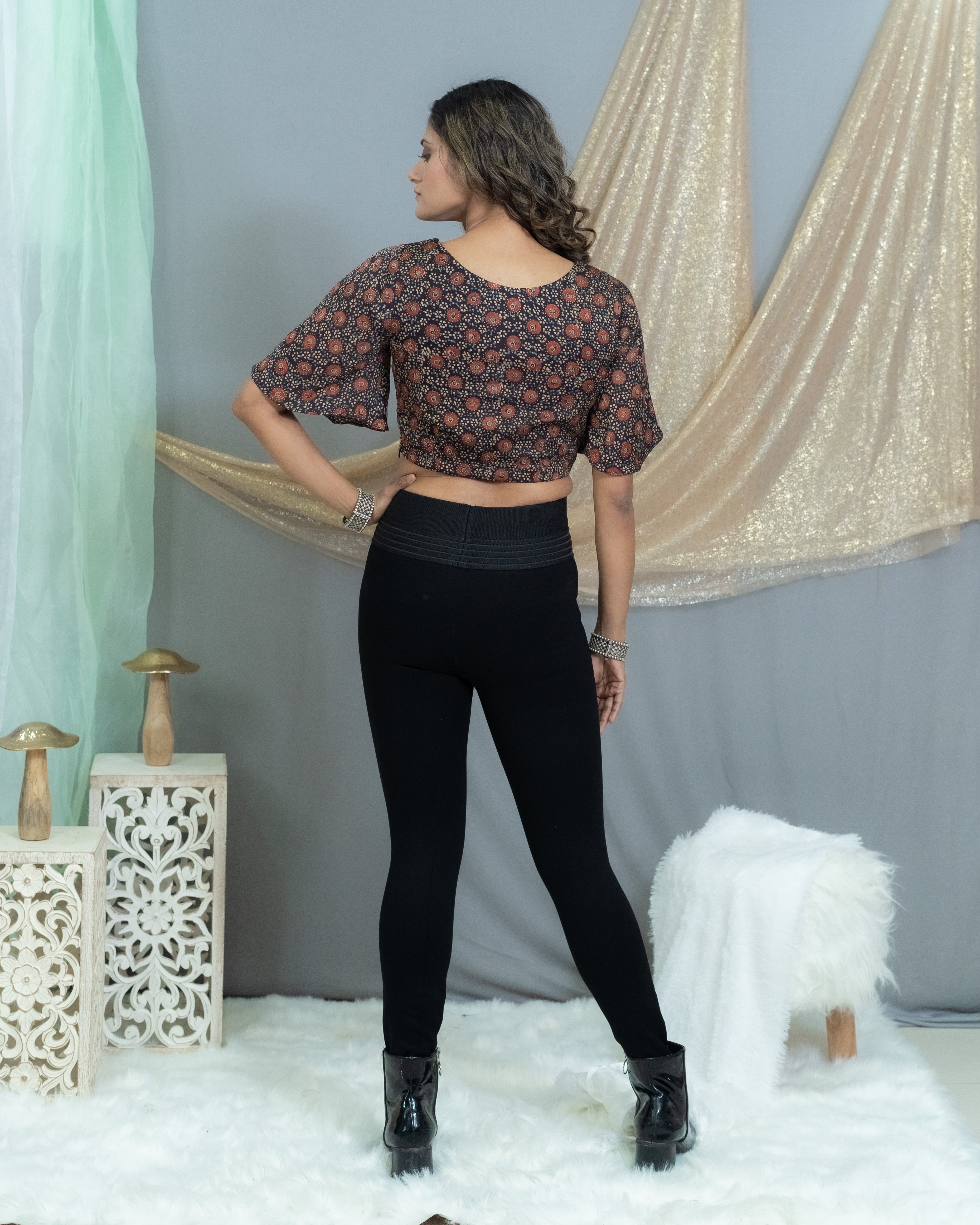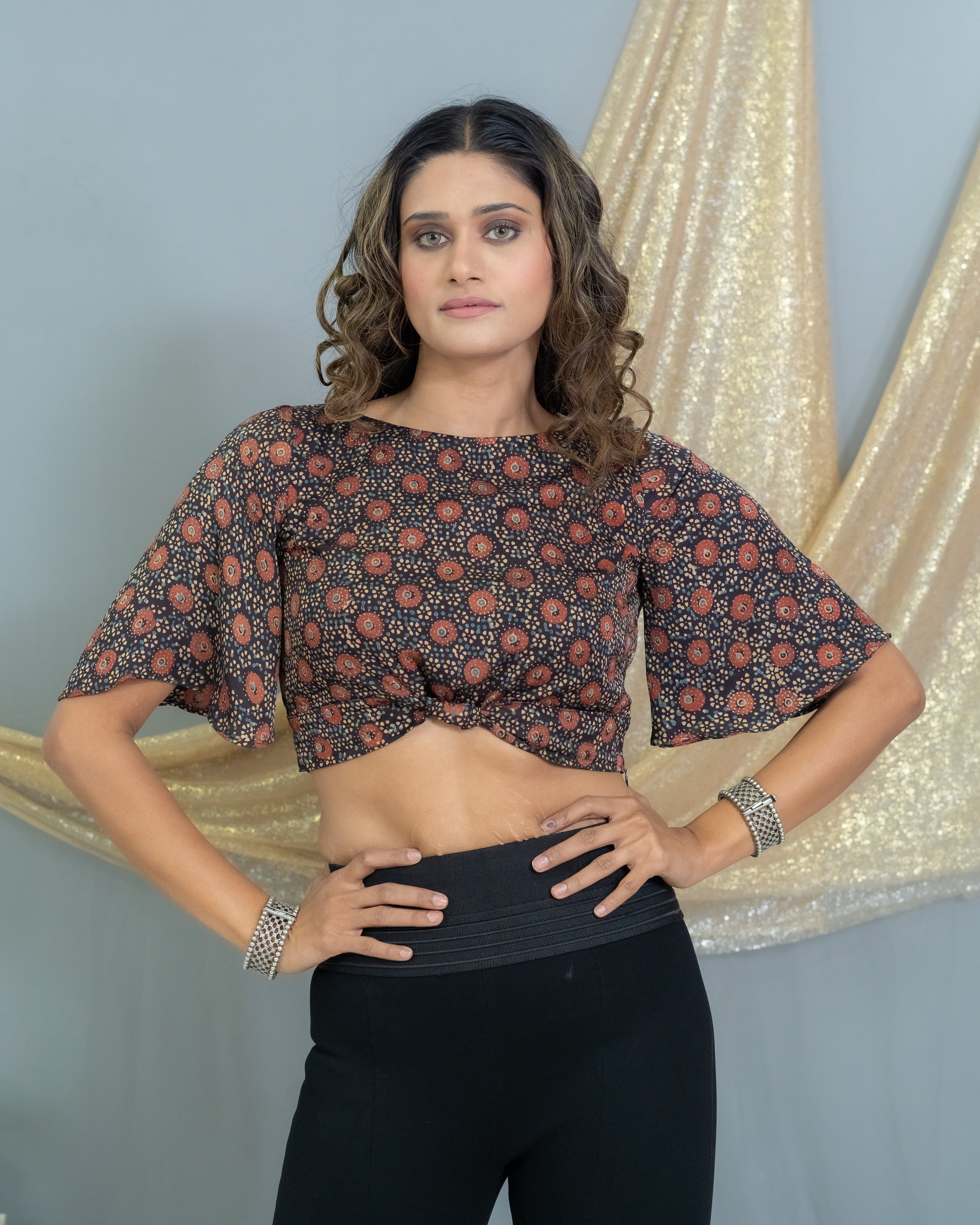 Black Modal silk Ajrakh handblock printed crop top with knot and butterfly sleeves