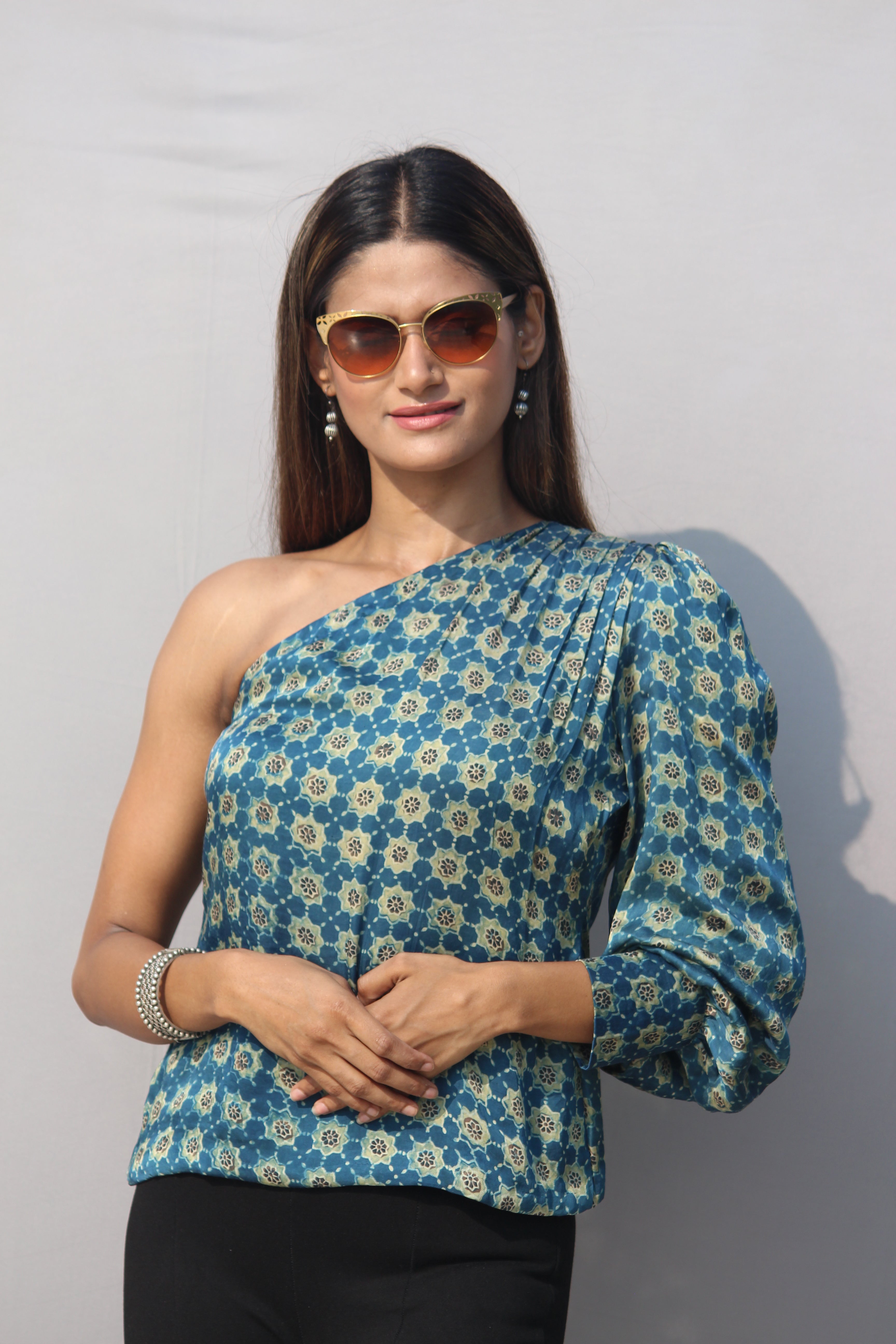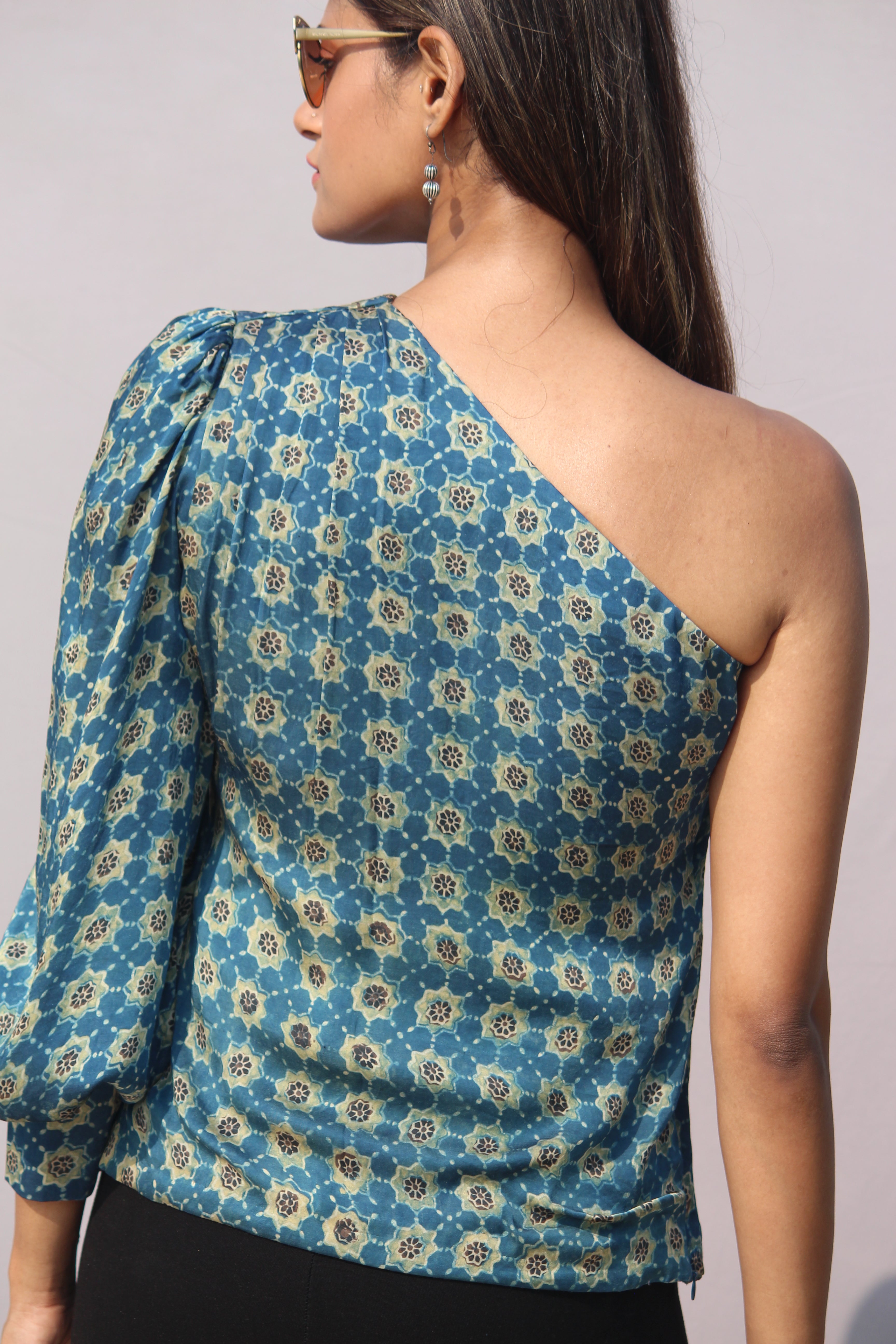 Indigo Ajrakh Handblock Printed Modal silk One sleeved Top