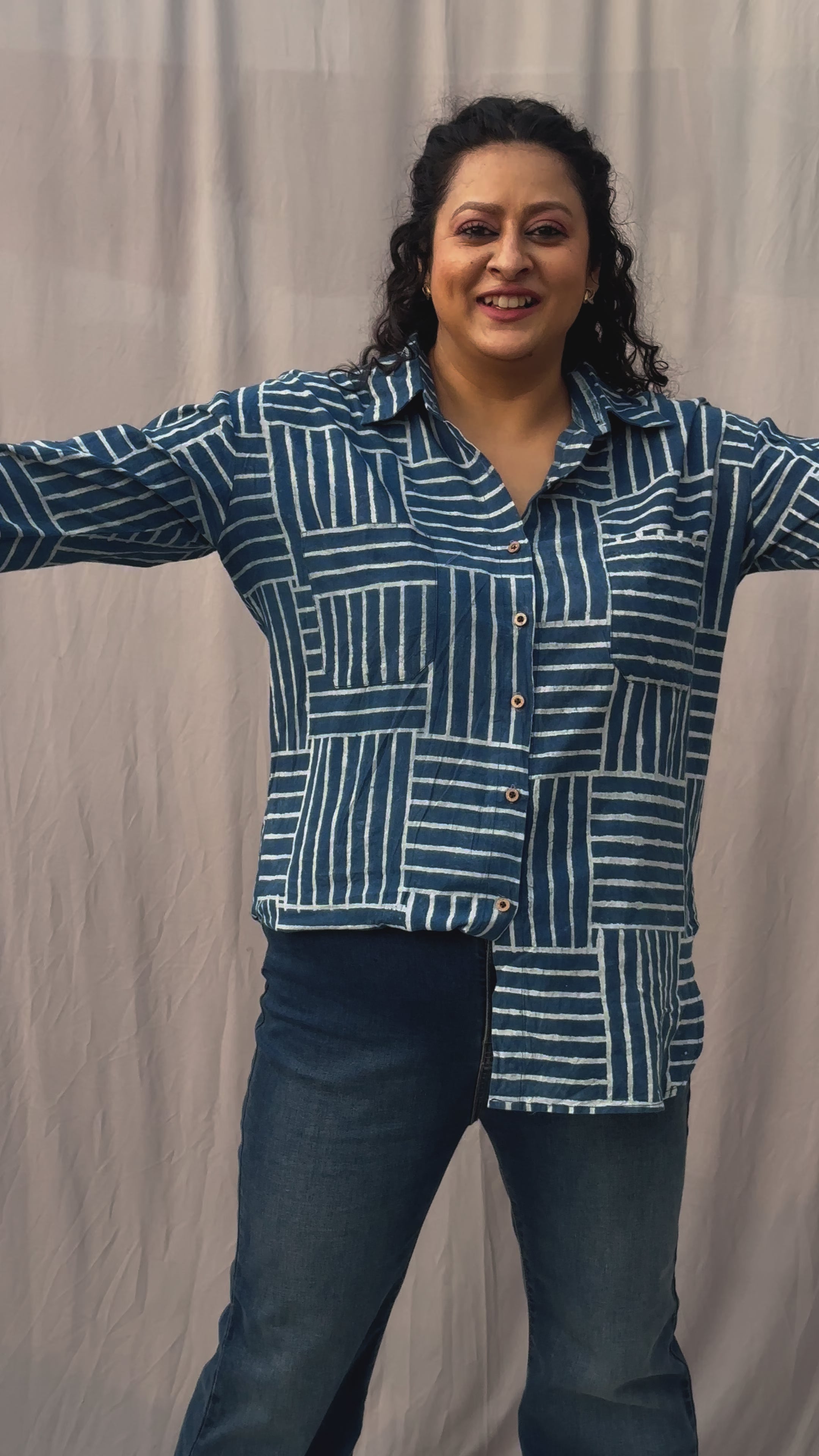 Indigo Dabu Brick Style over-sized Cotton Handblock Print Shirt for Women