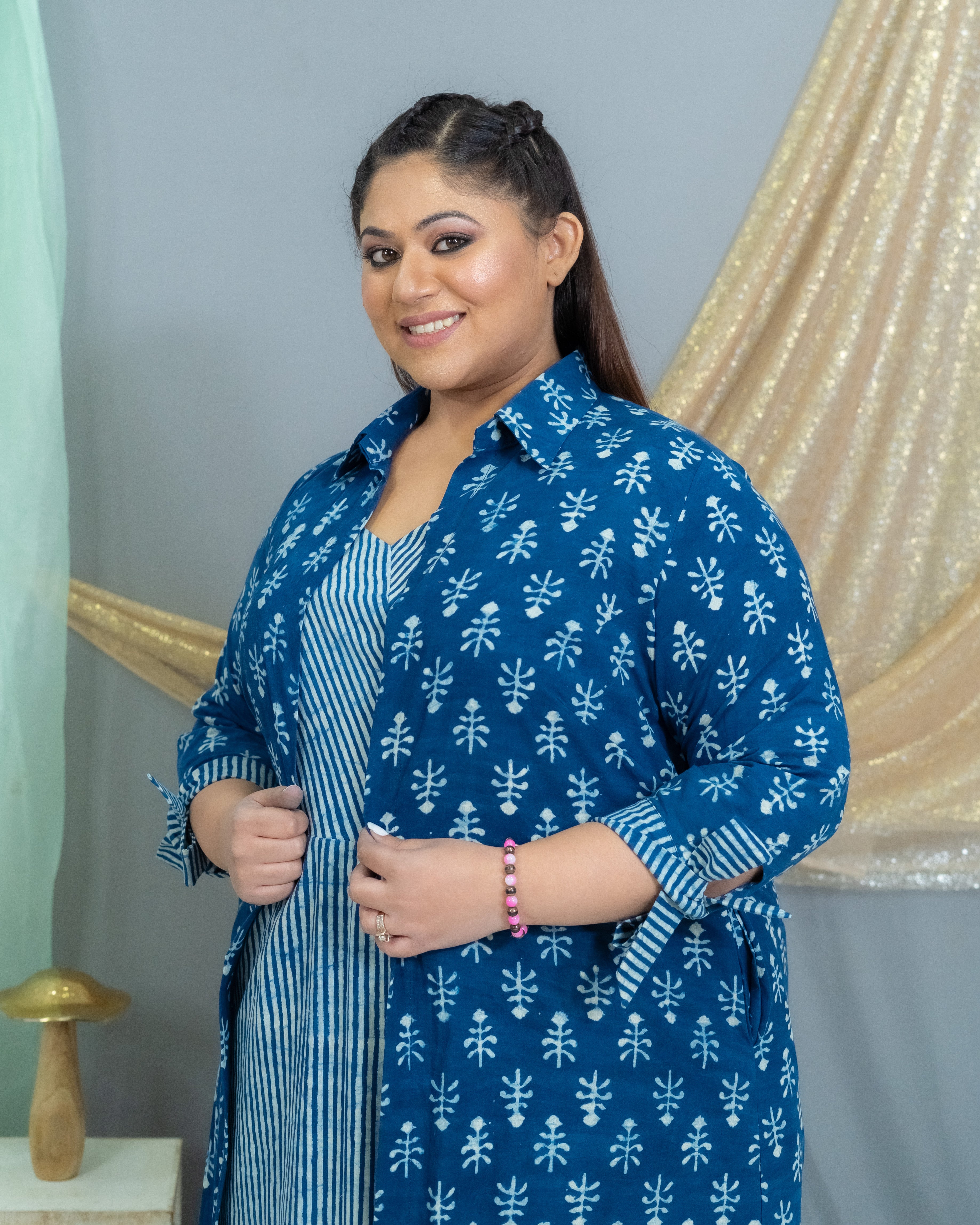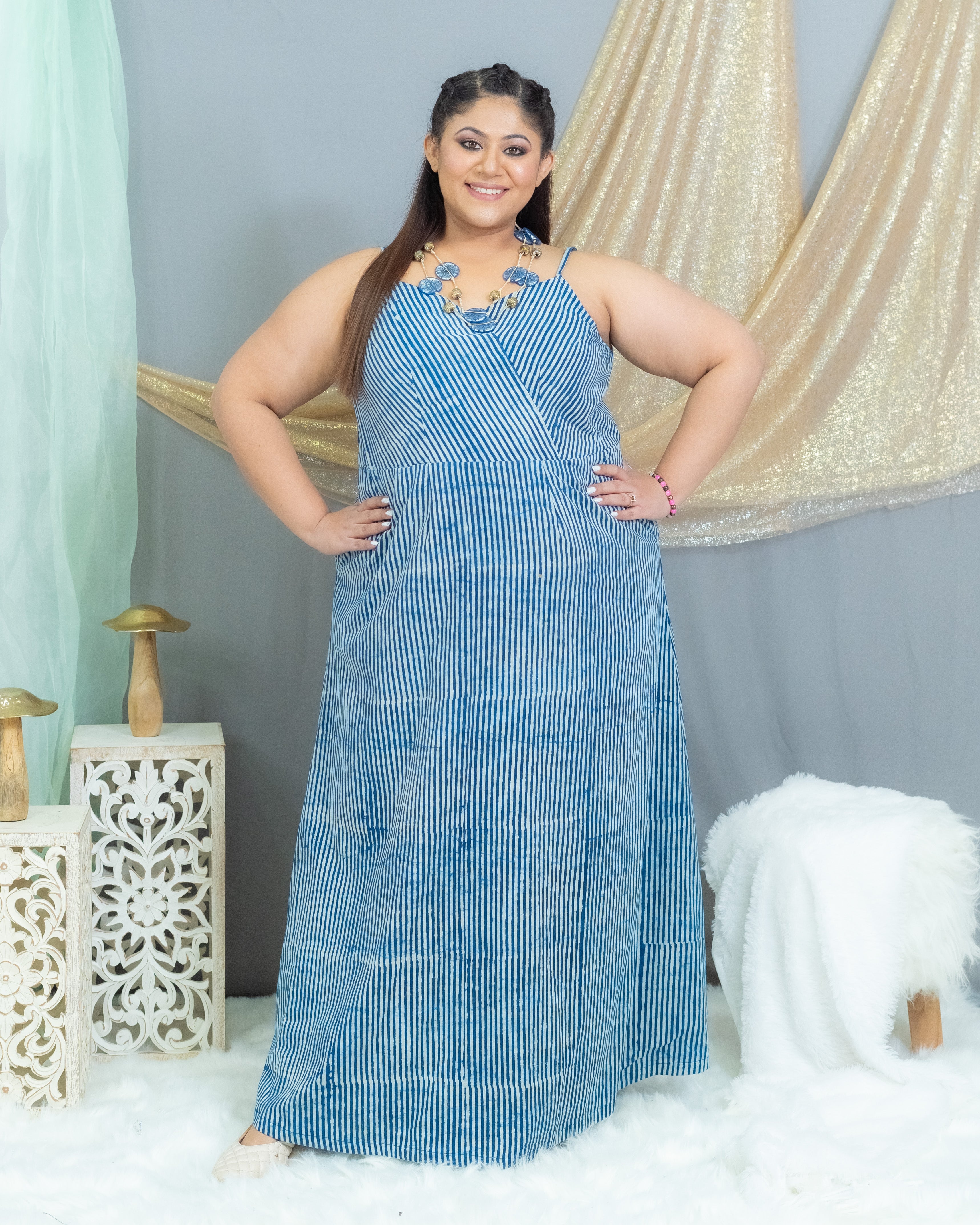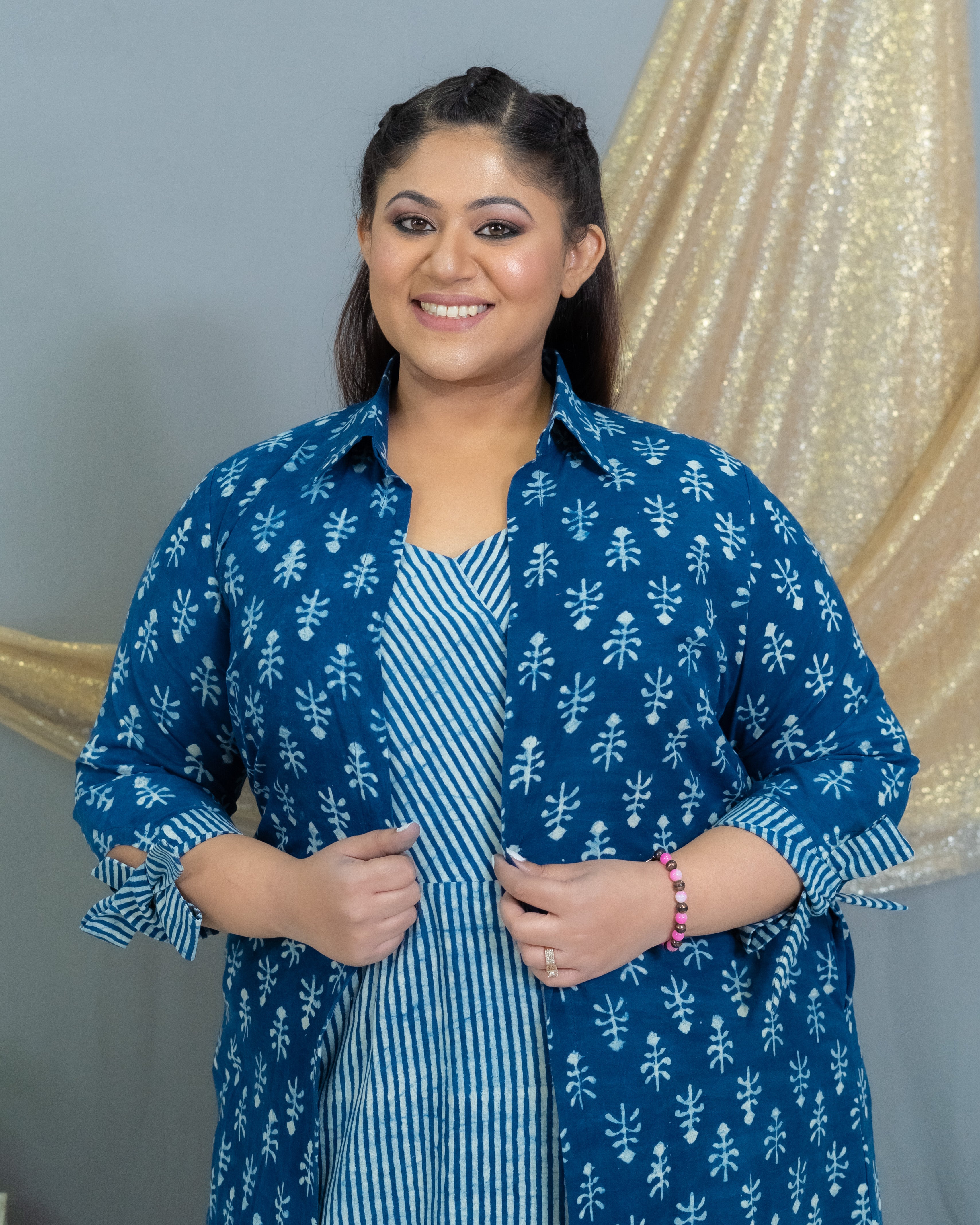 This two-piece maxi dress is the epitome of comfort and style. The Indigo Dabu hand block printed fabric is 100% cotton. You can pair the shrug with other outfits including denim, shorts, a skirt and even a saree. The noodle strap maxi dress can be worn alone with statement accessories. Both the shrug and the dress comes with pockets and two inches of extra margin.