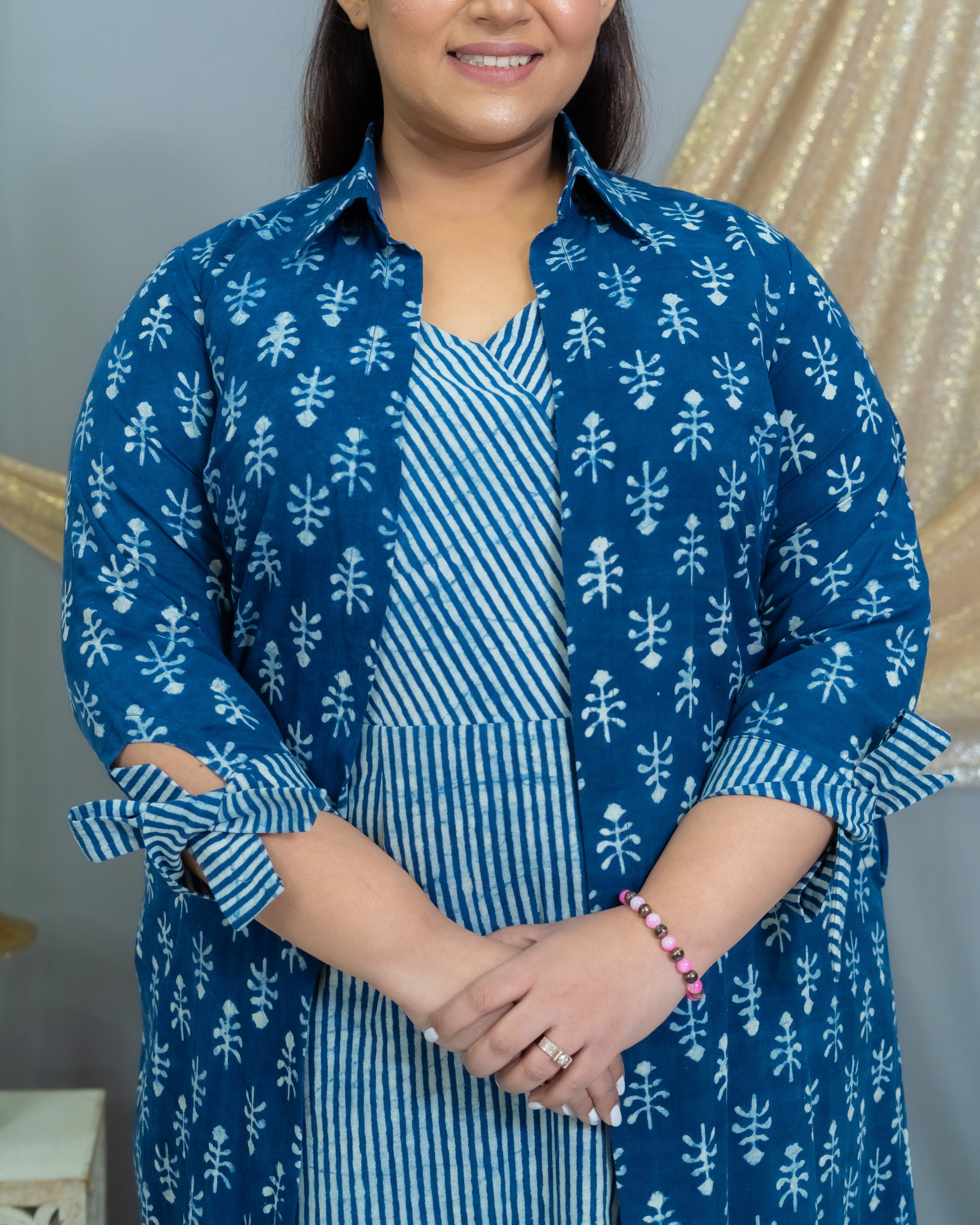 Indigo Dabu Handblock Printed Maxi Cotton Dress with Shrug