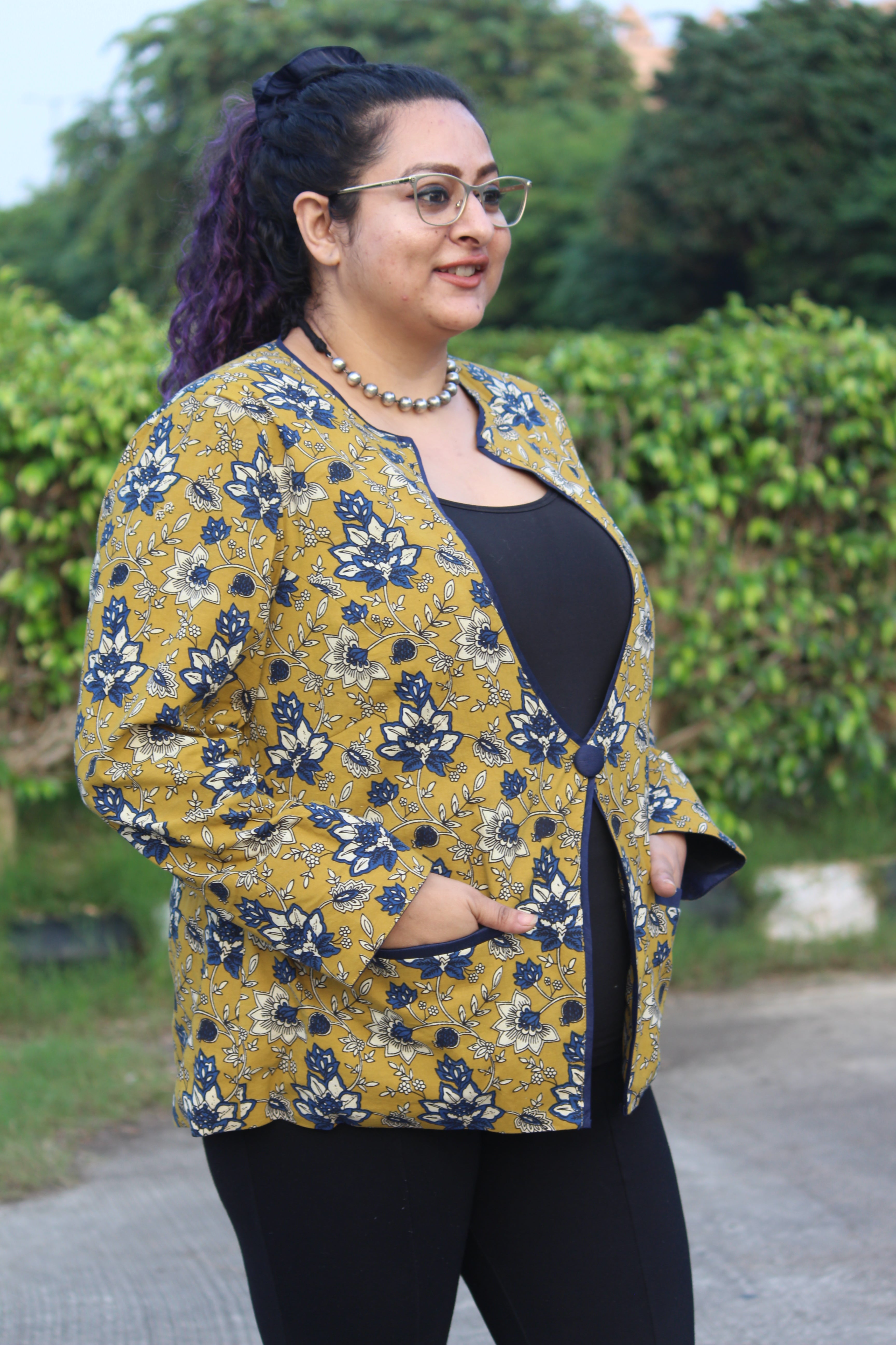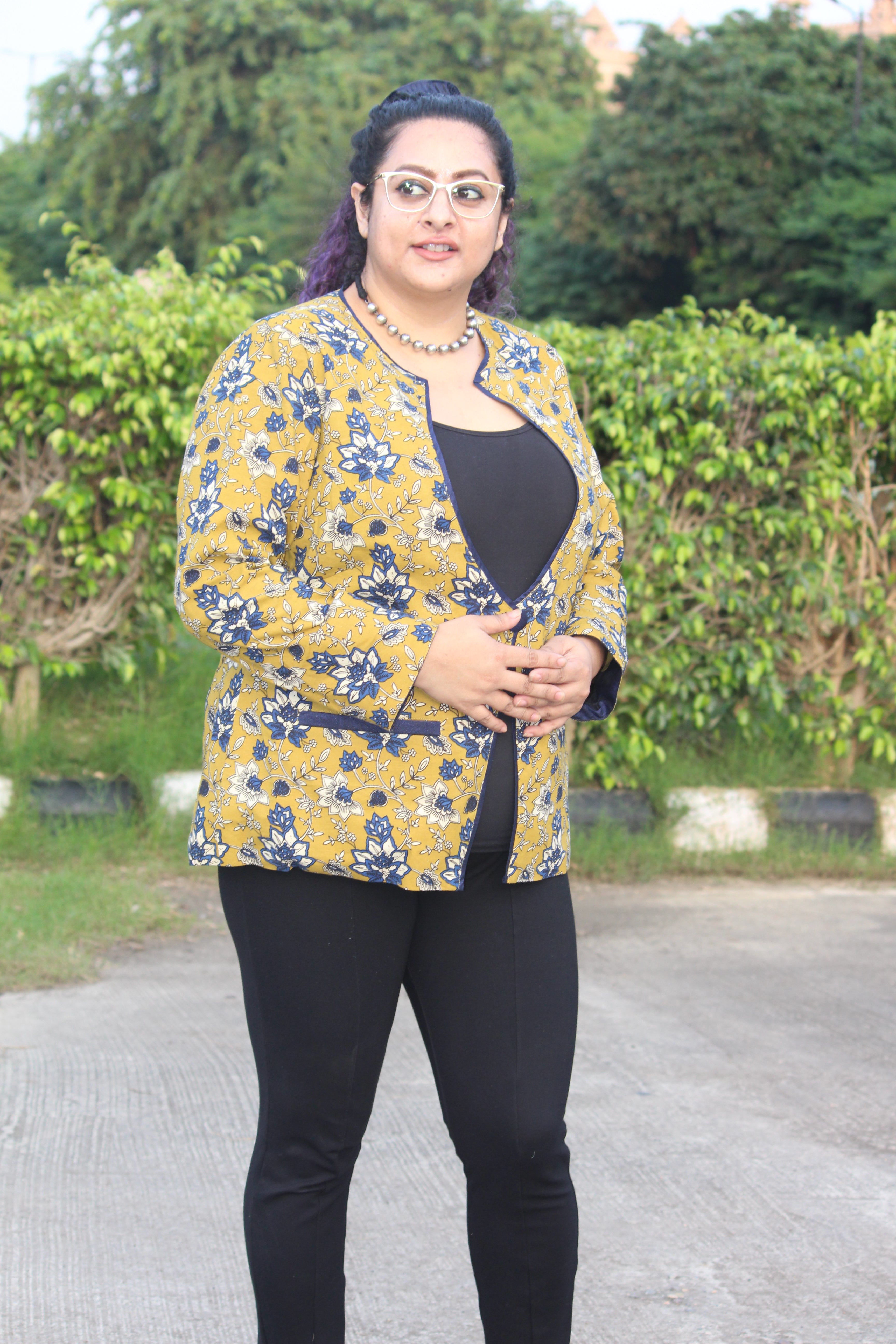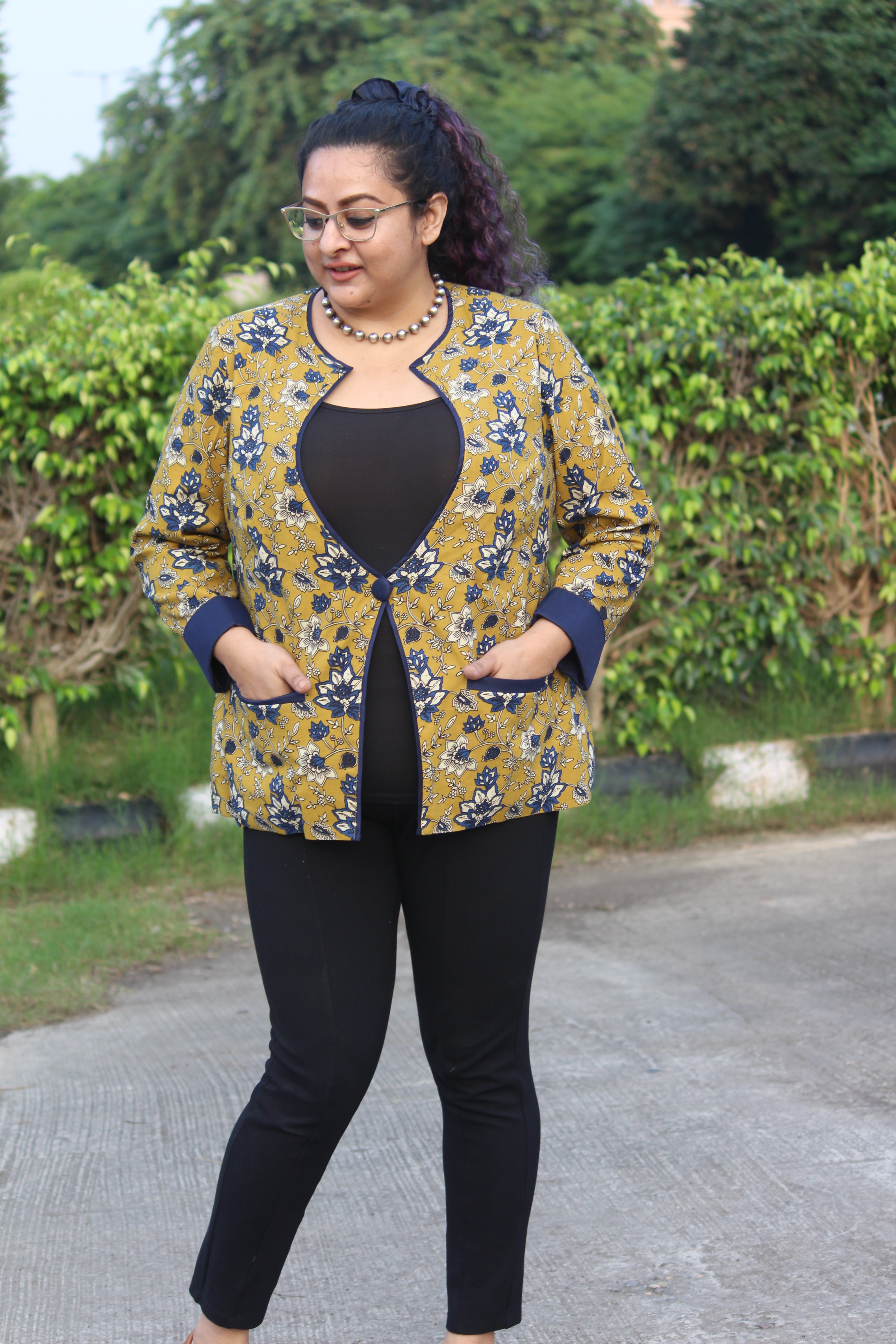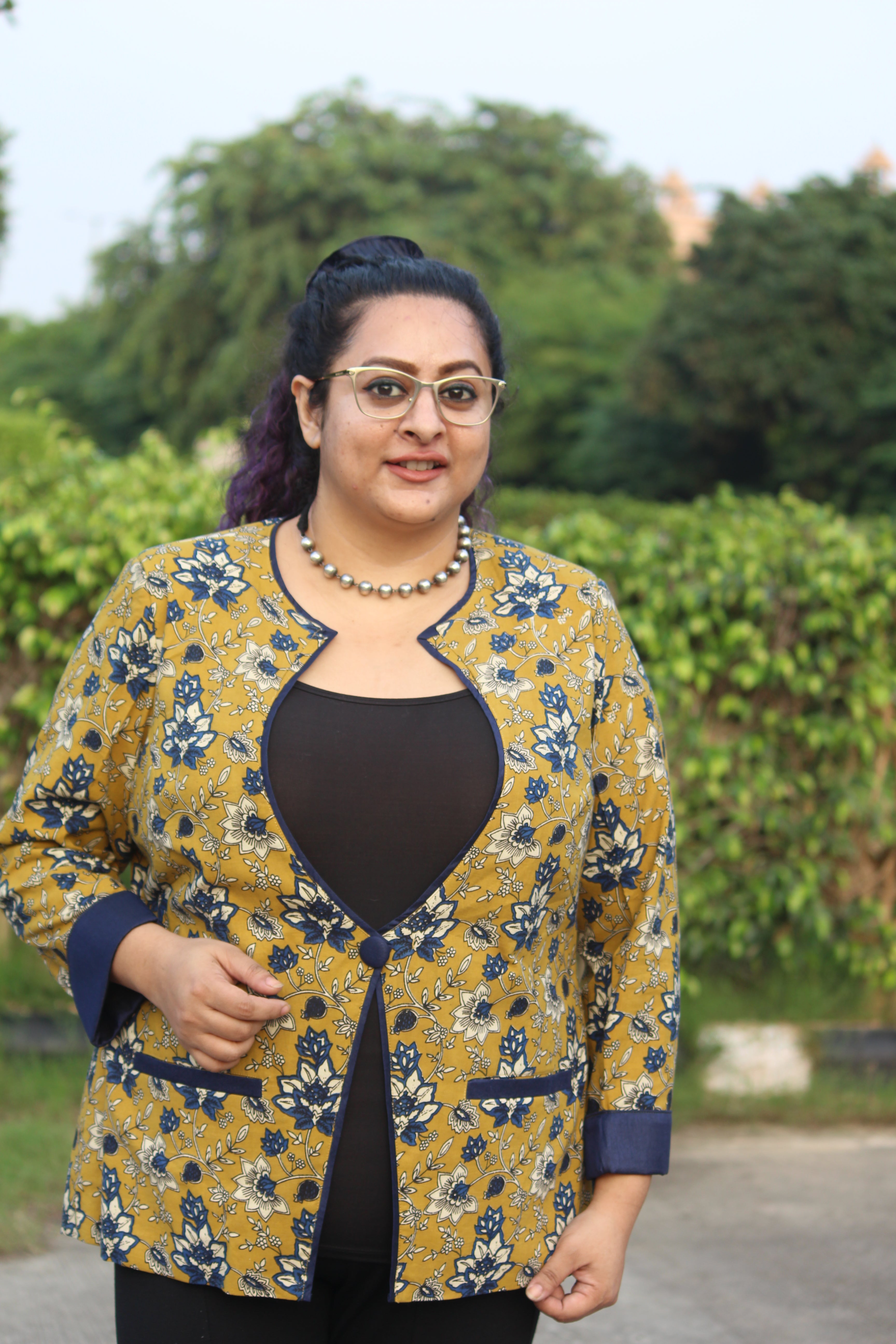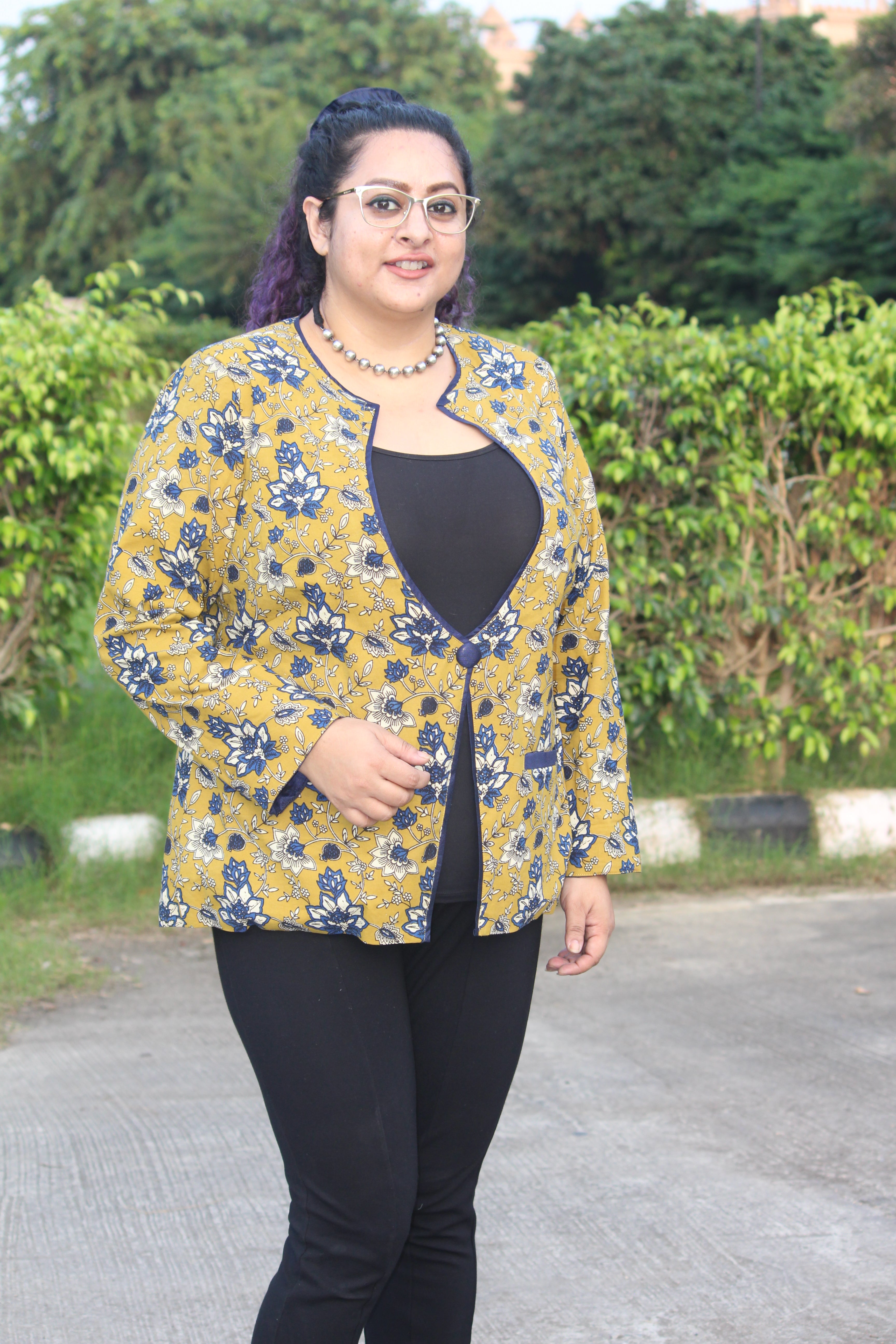 A cotton blazer made from Traditional Bagru Handblock printed fabric all the way from Bagru, Rajasthan. The blazer comes with double underlining, 2 pockets and 2 inches of extra margin. Perfect for summers, and "chilly winters inside your office".