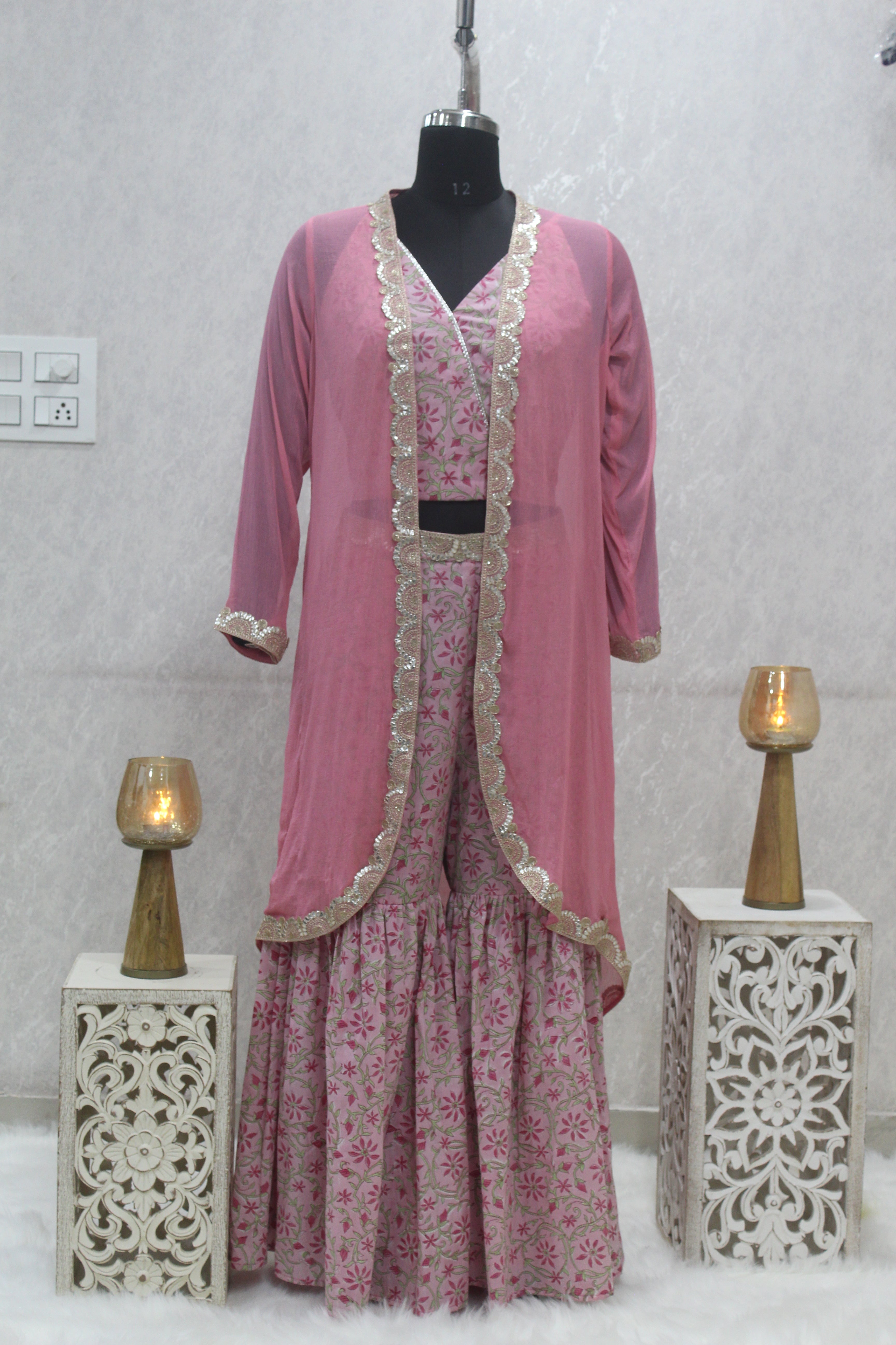 Pink Sanganeri Handblock Printed 3 piece sharara set