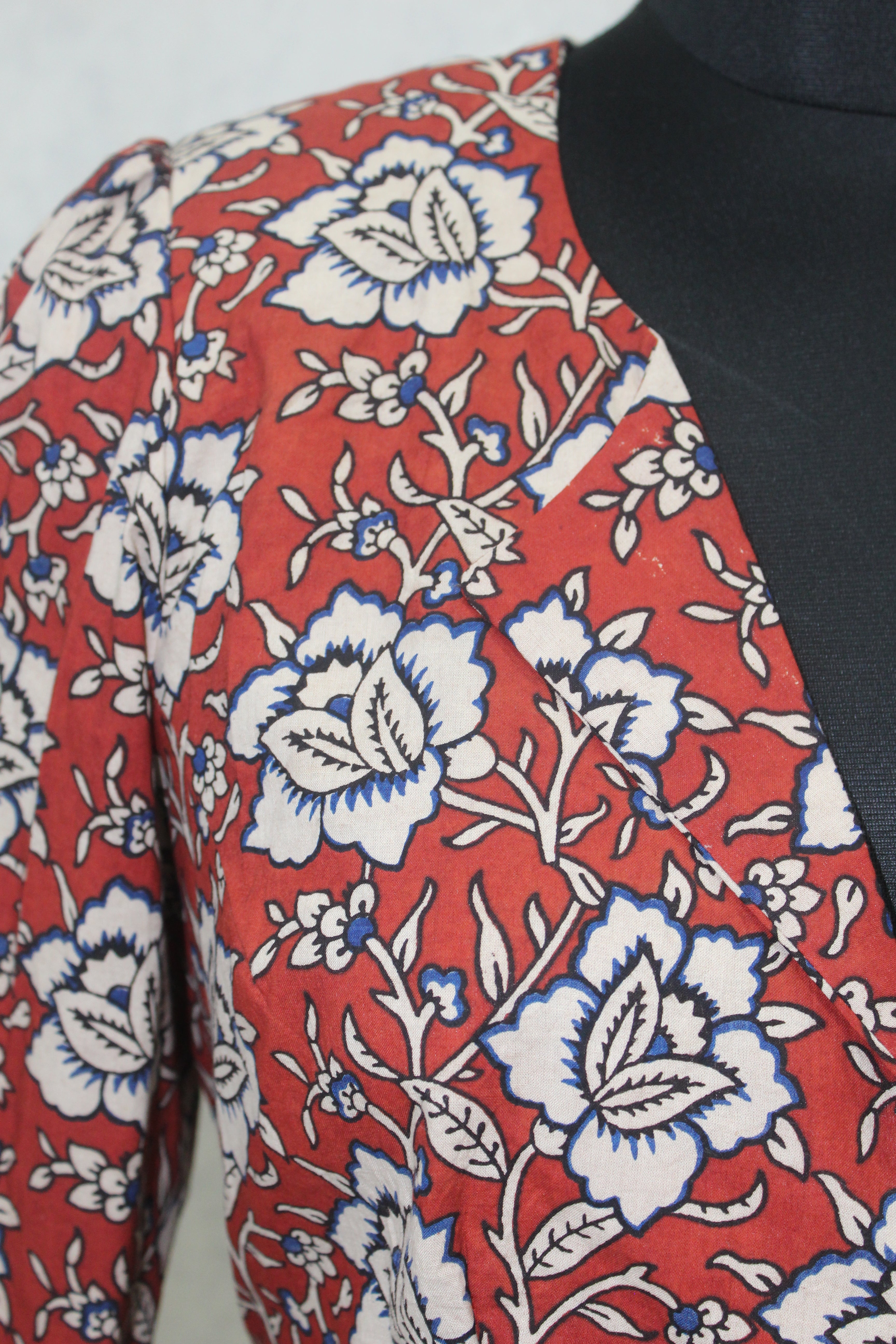 A cotton shrug made from Traditional Bagru Handblock printed fabric all the way from Bagru, Rajasthan The blazer comes with double underlining, and 2 inches of extra margin. Perfect for summers, and "chilly winters inside your office".