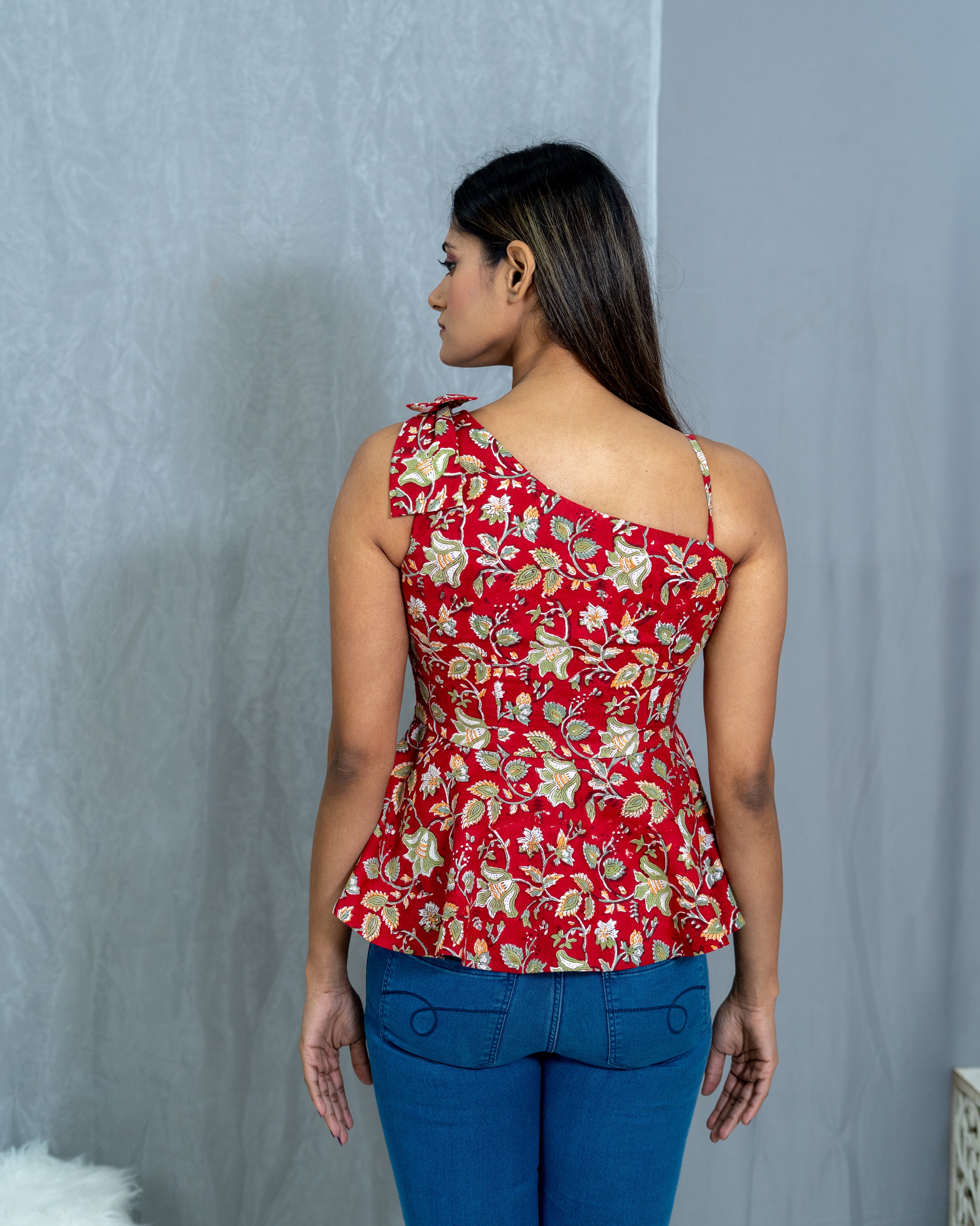 Red sanganeri hand block one shoulder peplum top