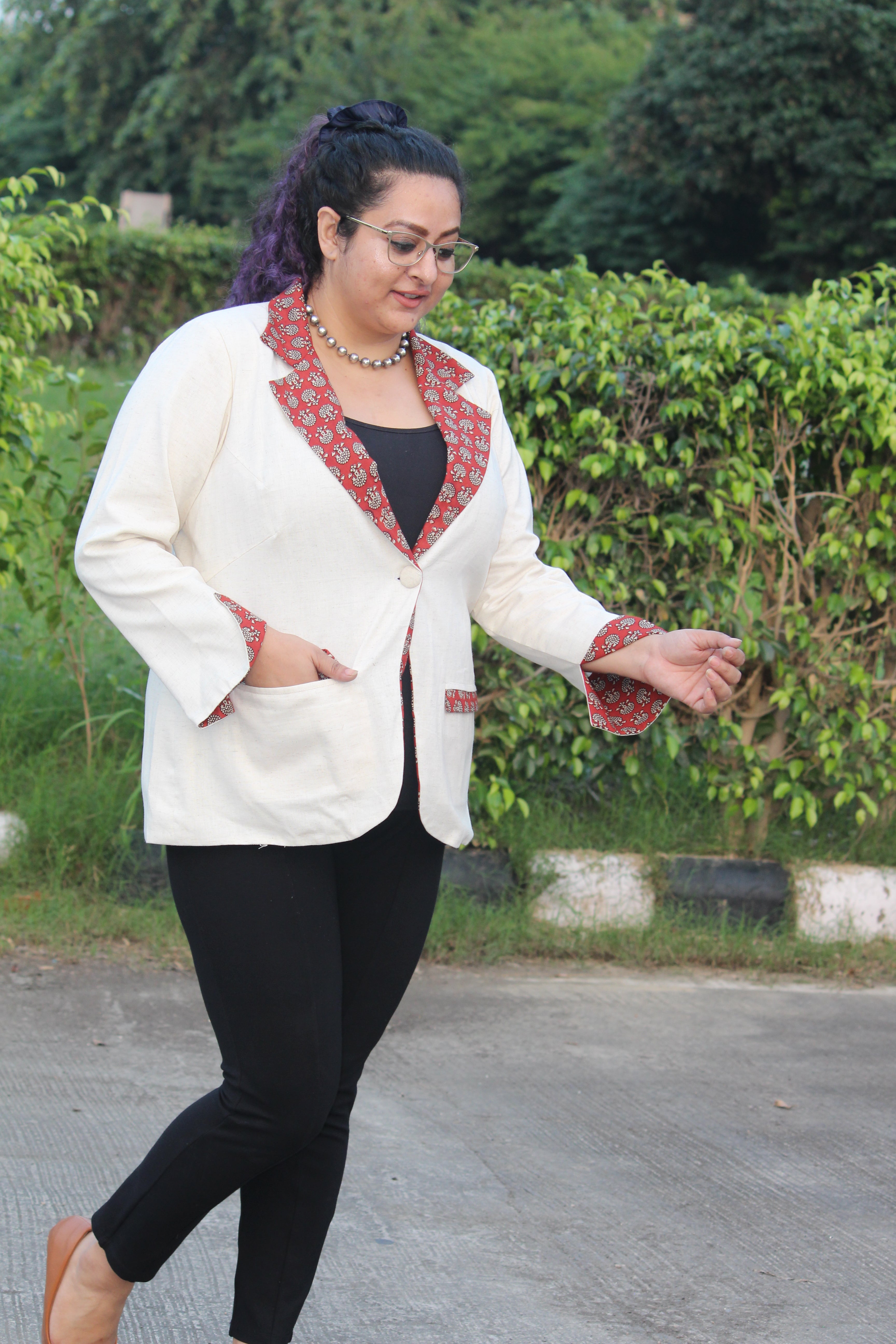 White Cotton Blazer with Red Bagru Handblock Printed Collar