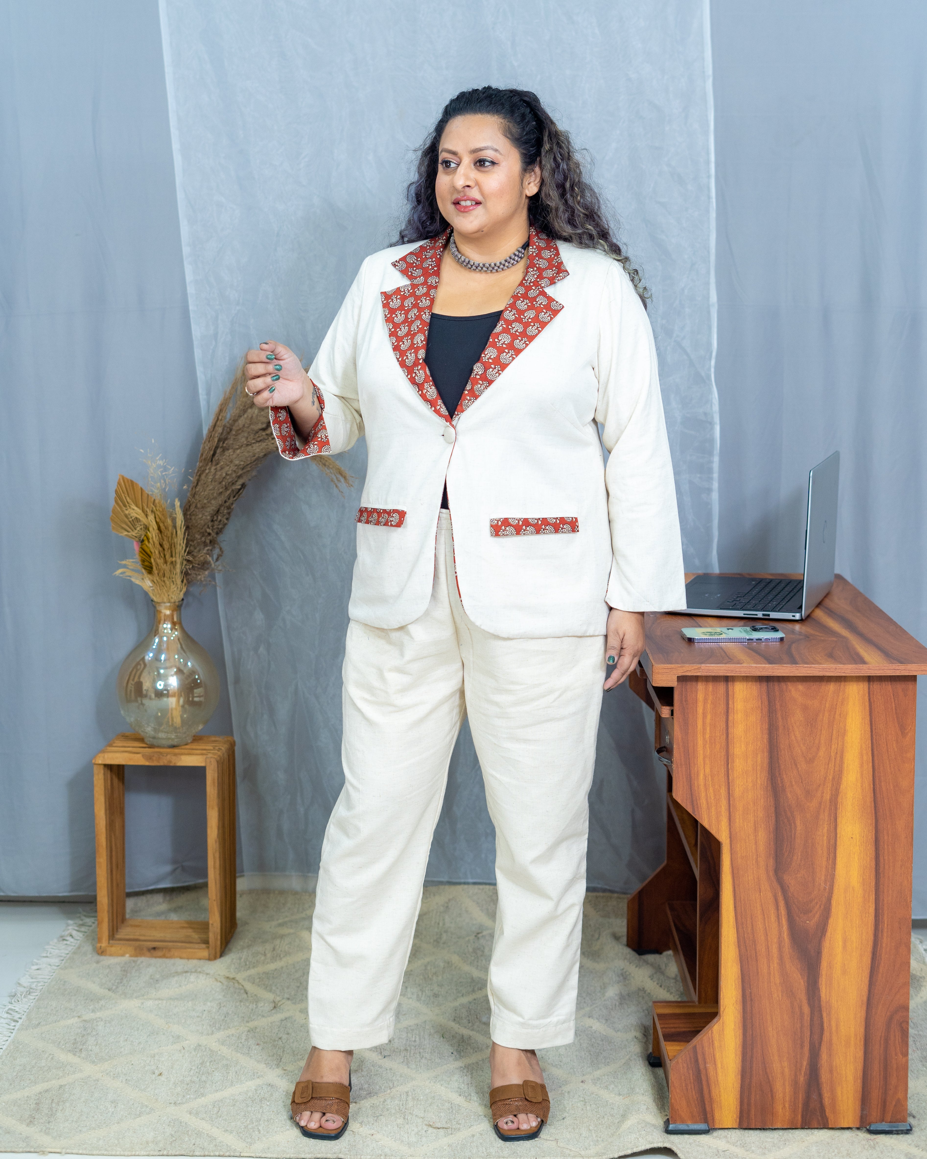 Introducing a wide range of cotton blazer and pant set in handblock printed fabric. This bagru handblock print fabric is sourced from Bagru, Rajasthan.