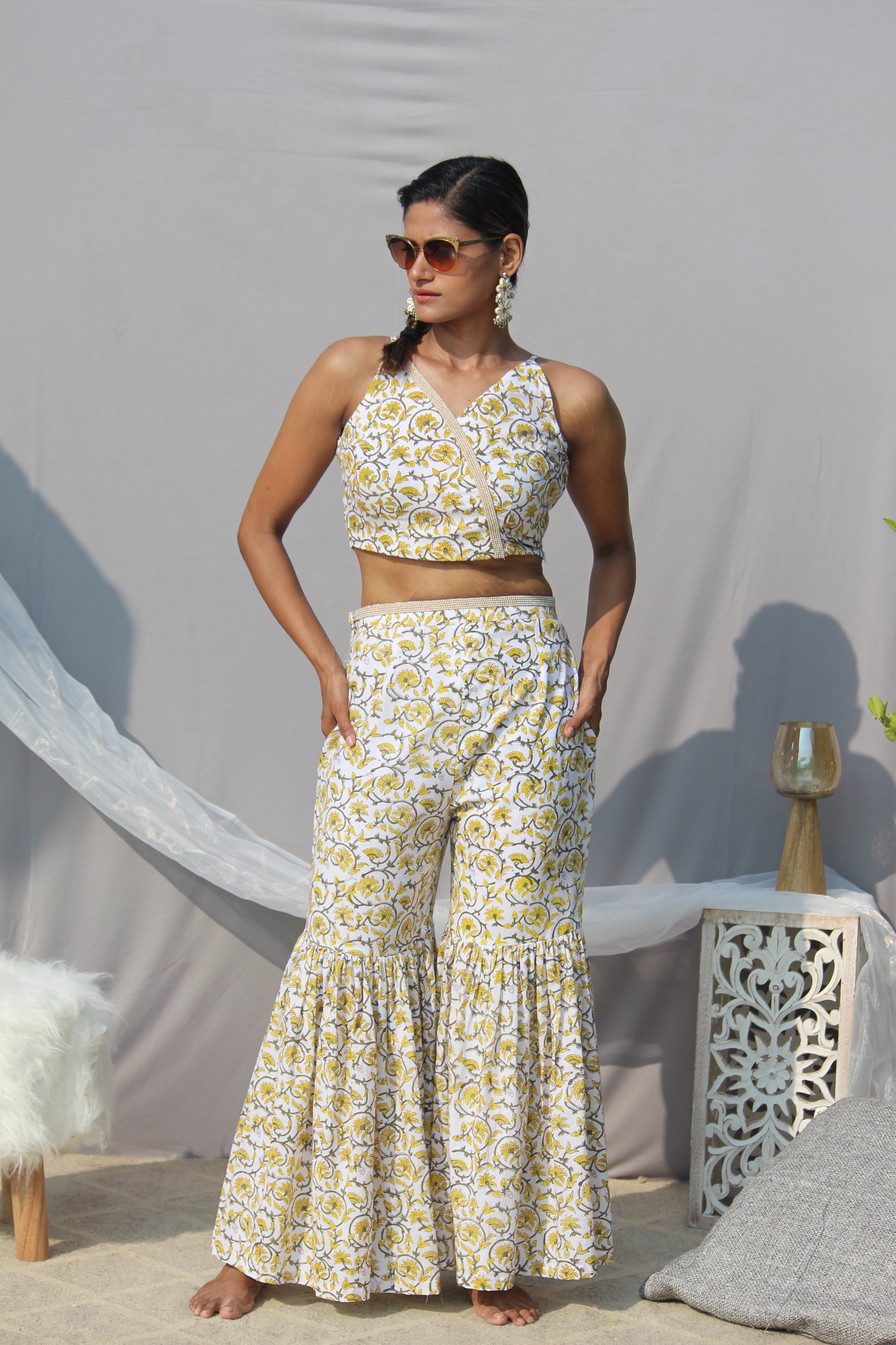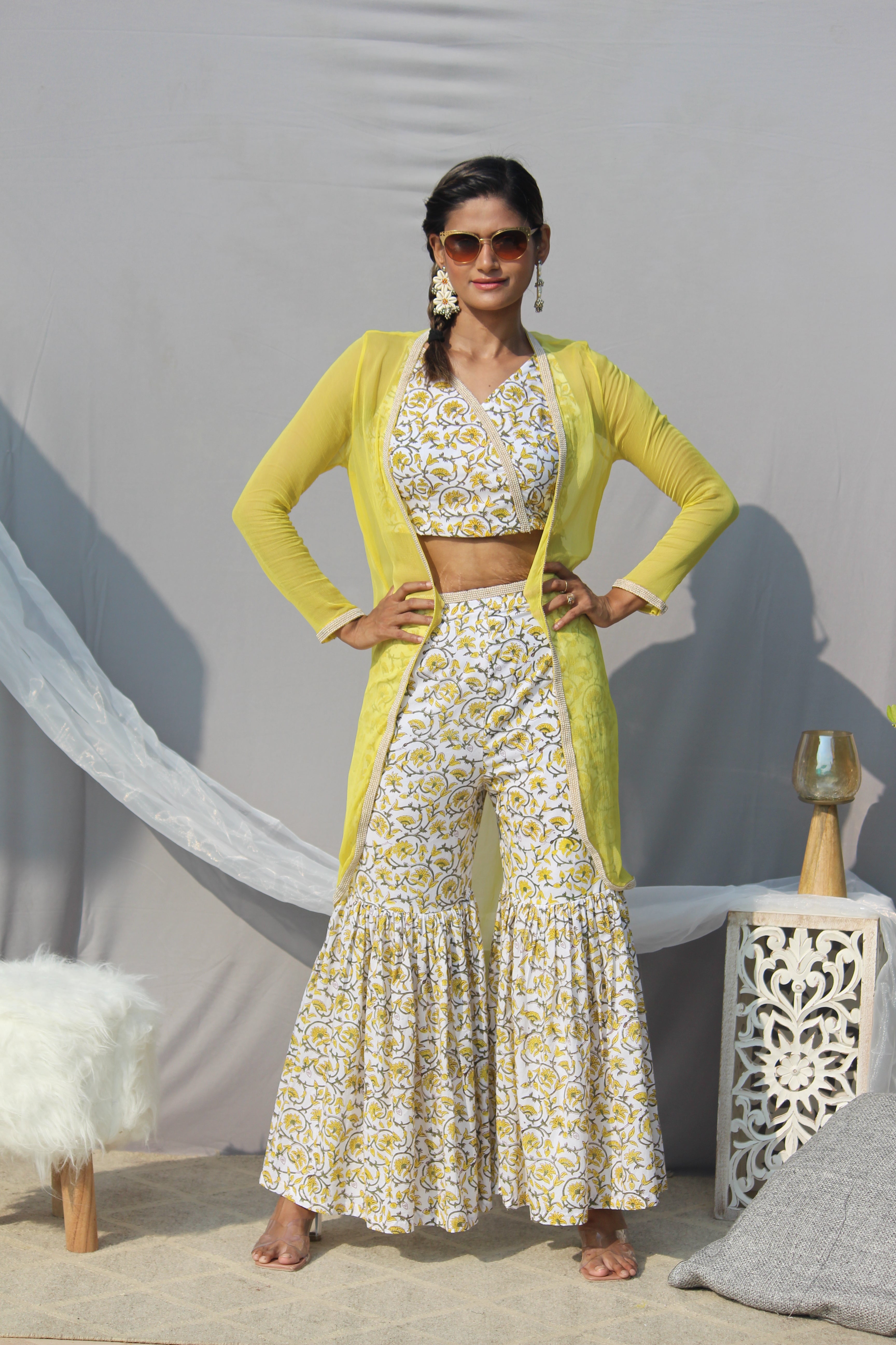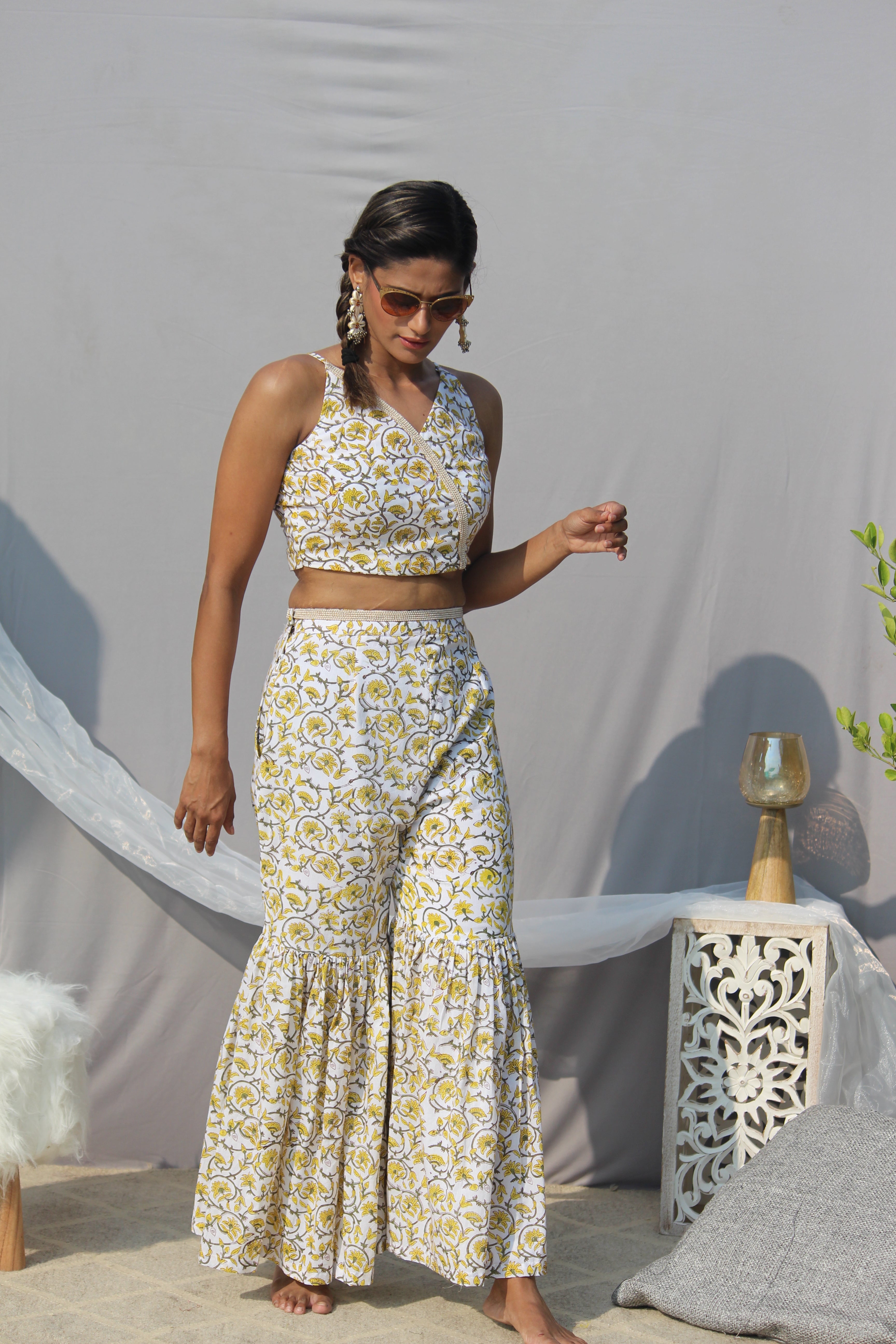 THIS 3 PIECE SHARARA SET IS PERFECT FOR ALL FESTIVE SEASON. The sharara comes with 2 pockets. The entire outfit has cotton underlining and extra margin. The Sanganeri cotton fabric is sourced from the village of Sanganer, Rajasthan