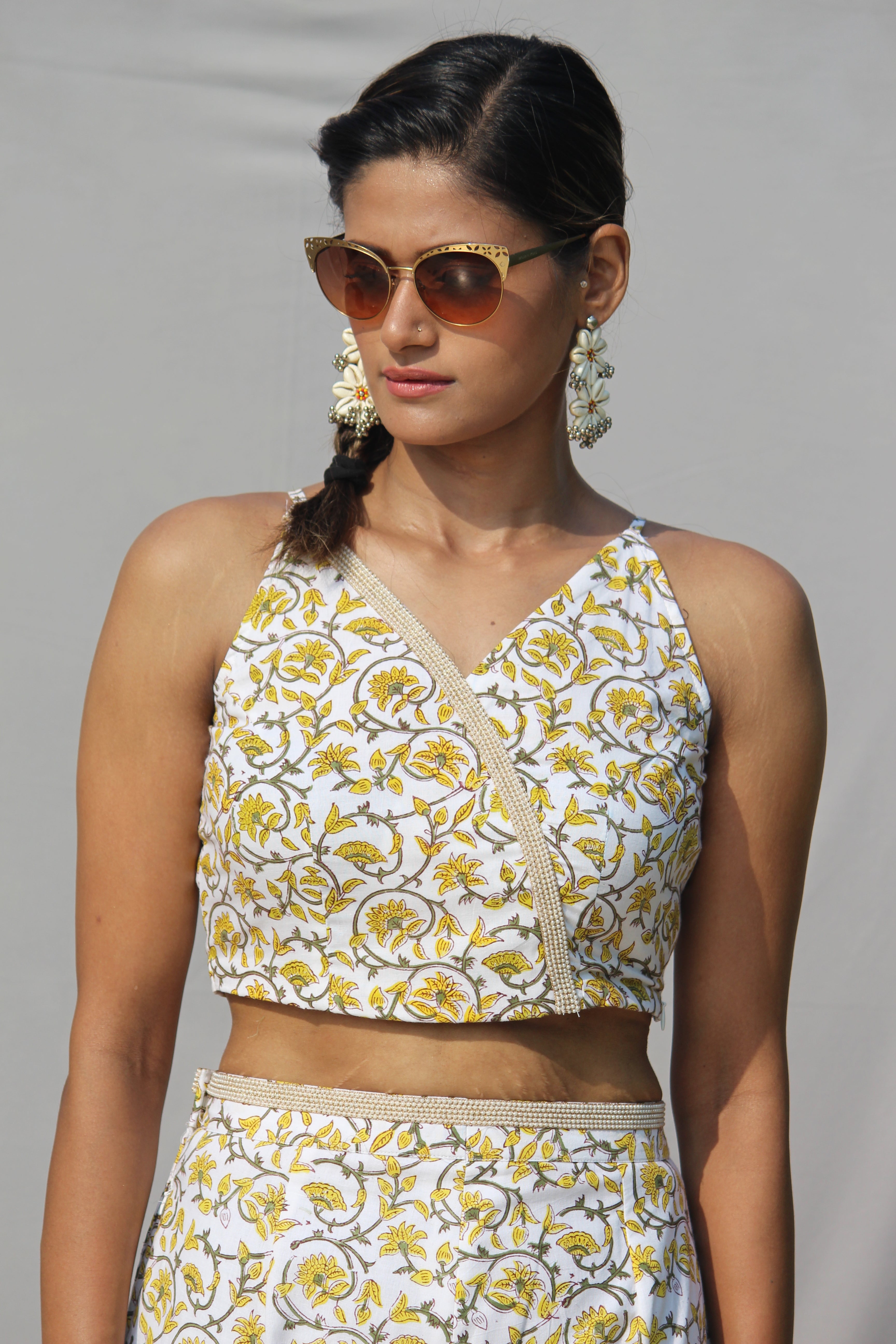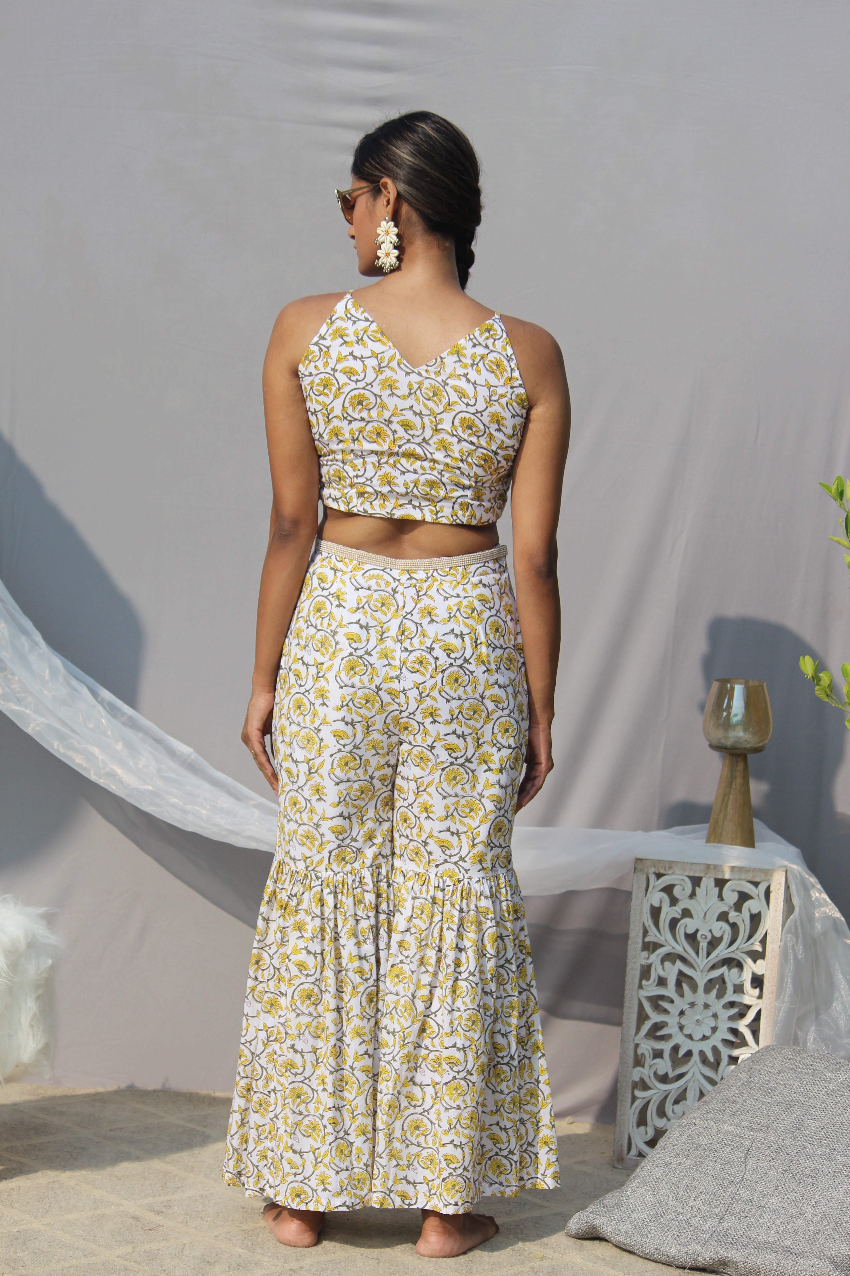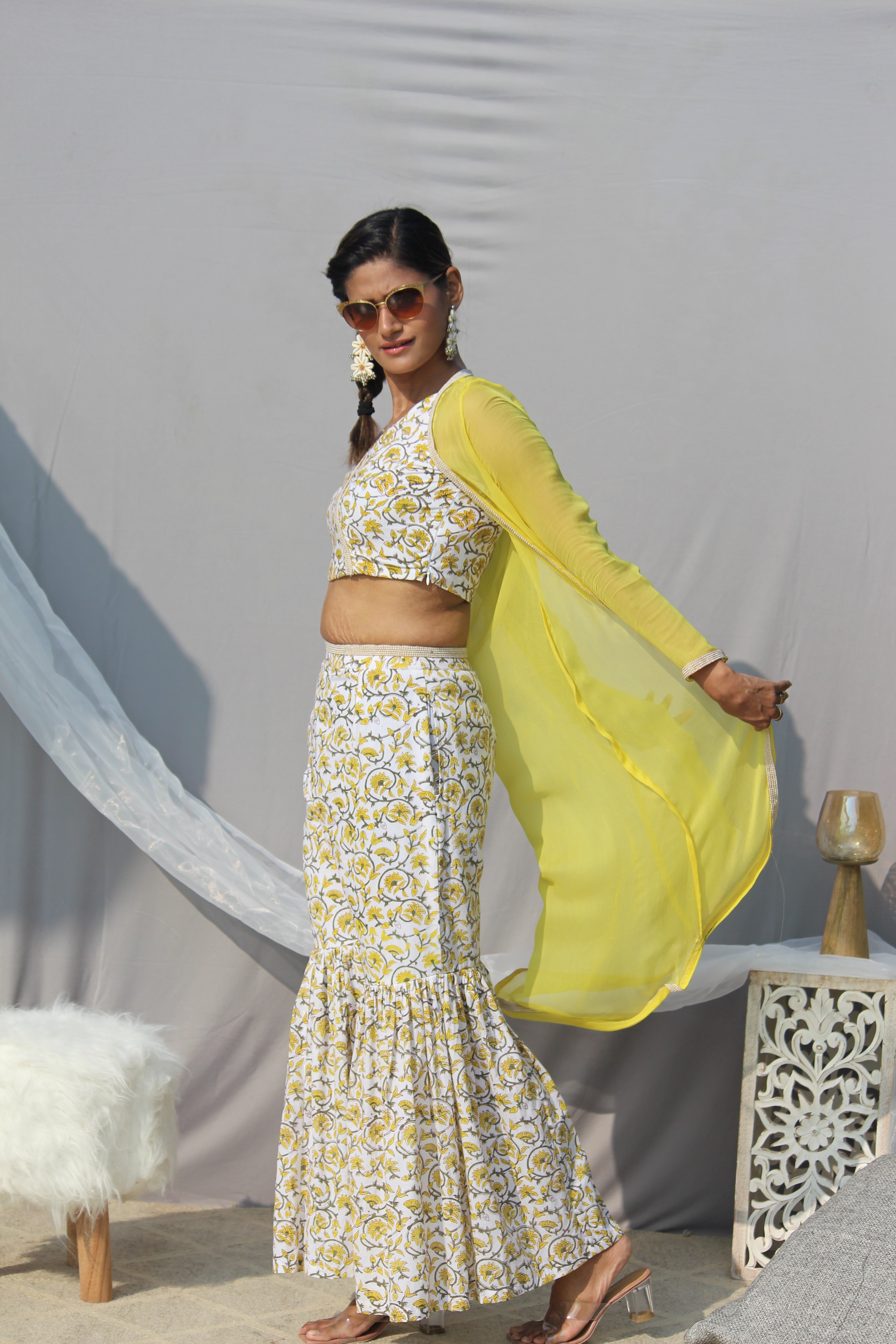 THIS 3 PIECE SHARARA SET IS PERFECT FOR ALL FESTIVE SEASON. The sharara comes with 2 pockets. The entire outfit has cotton underlining and extra margin. The Sanganeri cotton fabric is sourced from the village of Sanganer, Rajasthan